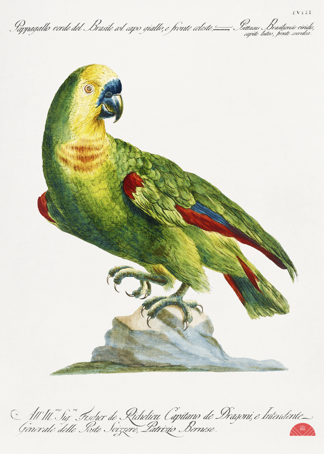 Pappagallo verde del Brasile col capo giallo e fronte celeste Parrot Bird of Paradise by Saverio Manetti 1723–1785.