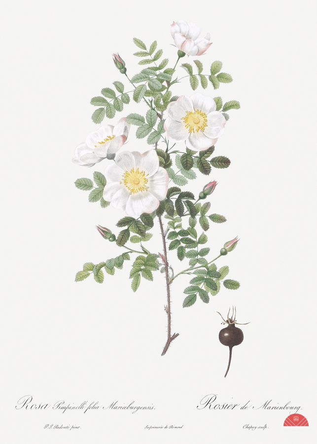 Burnet Rose Rosa pimpinellifolia from Les Roses 1817–1824 by Pierre-Joseph Redouté.