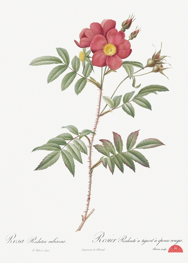 Red-Leaved Rose also known as Rose Tree with Red Stems and Spines Rosa redutea glauca from Les Roses 1817–1824 by Pierre-Joseph Redouté.