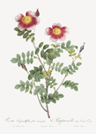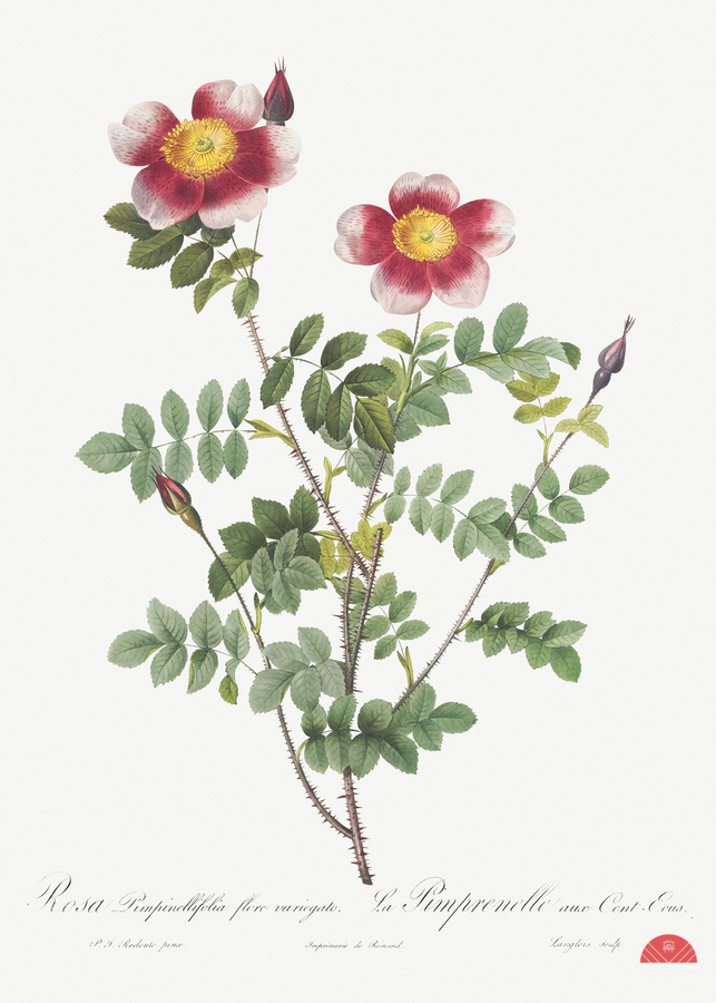 Variegated Flowering Variety of Burnet Rose Rosa pimpinellifolia flore variegato from Les Roses 1817–1824 by Pierre-Joseph Redouté.