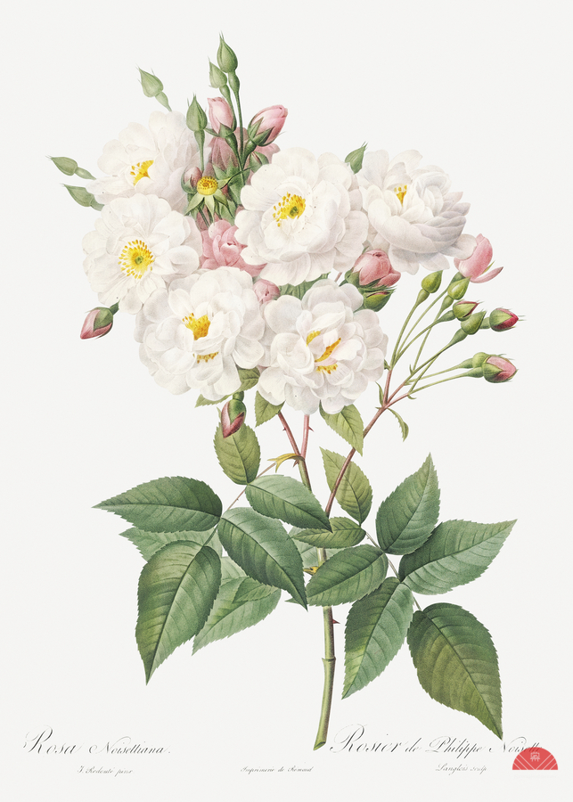 Rosa × noisettiana also known as Rose of Philippe Noiselle from Les Roses 1817–1824 by Pierre-Joseph Redouté.