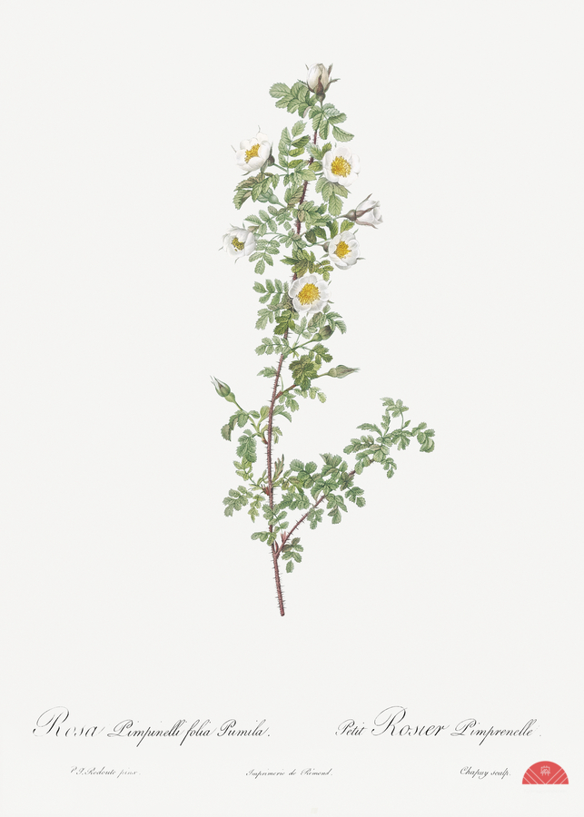 Burnet Rose Rosa pimpinellifolia pumila from Les Roses 1817–1824 by Pierre-Joseph Redouté.