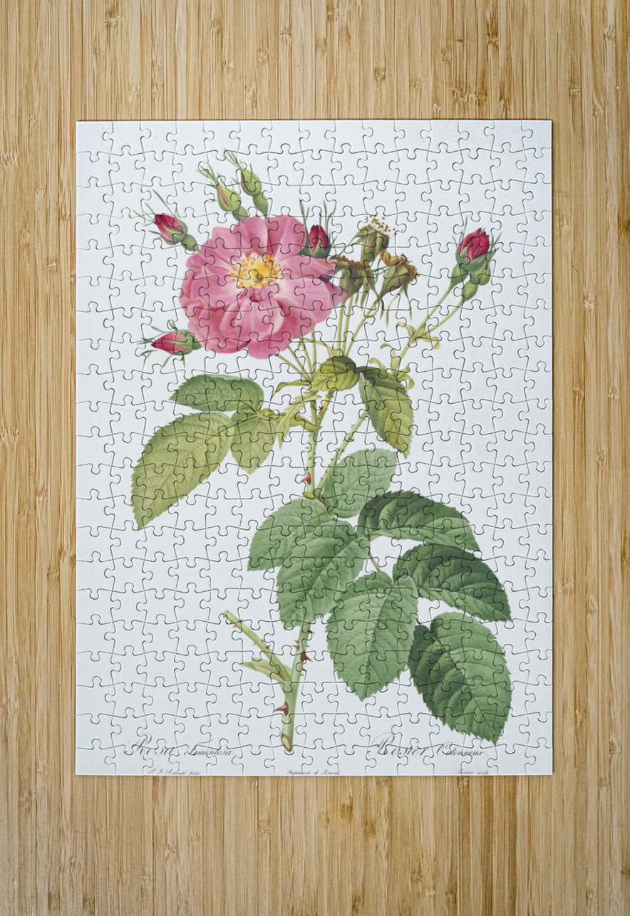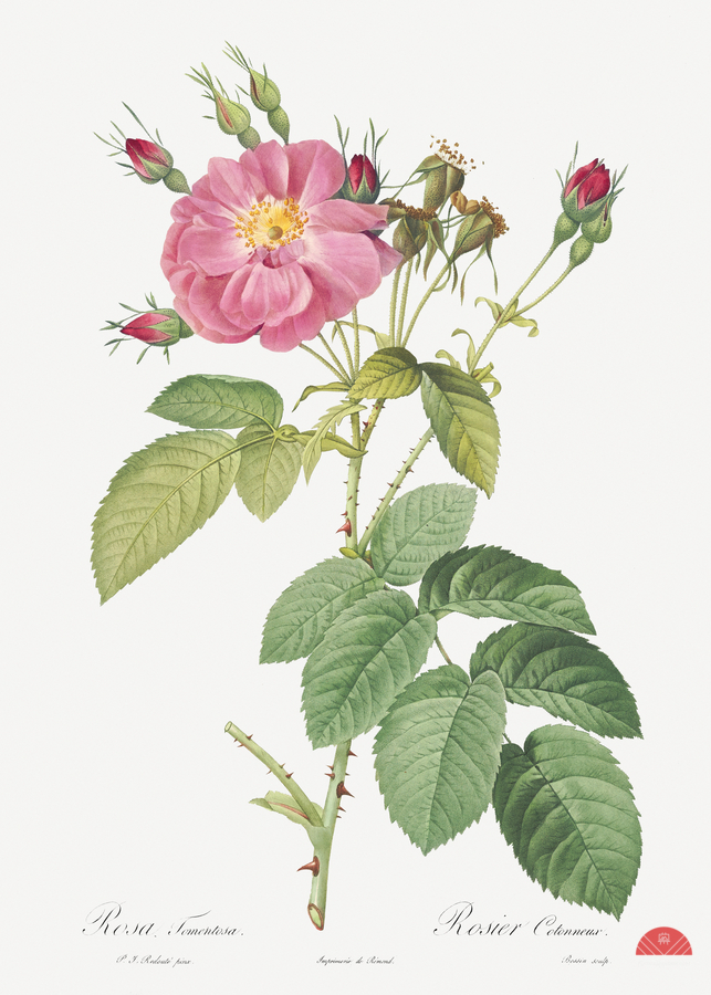 Harsh Downy Rose also known as Cotton Rose Rosa tomentosa from Les Roses 1817–1824 by Pierre-Joseph Redouté.