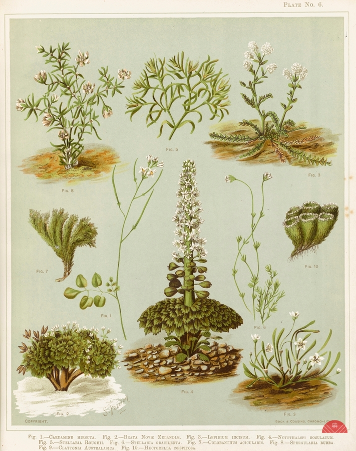 Fig. 1 Cardamine hirsuta. Fig 2. Braya novae zelandie. Fig 3. Lepidium incisum. Fig 4. Notothalspi rosulatum Plate 6 Sarah Featon New Zealander 1848 β...[+]