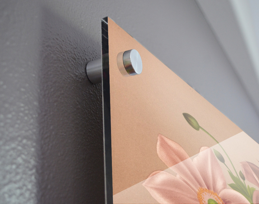 Printed to the edge - Ready to hang - provided with 4 premium polished aluminum stand off ( wall screws and mounting hardware provided ) We suggest a thicker 3/16" acrylic for any size over 42 inches to guarantee a straight acrylic, without curvature