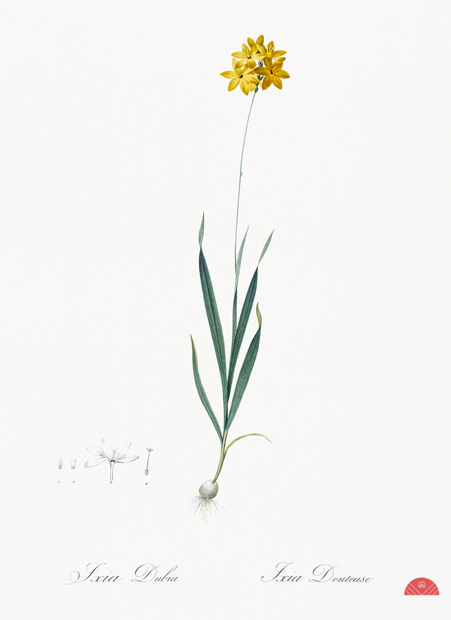 Orange Ixia illustration from Les liliacées 1805 by Pierre Joseph Redouté 1759-1840.