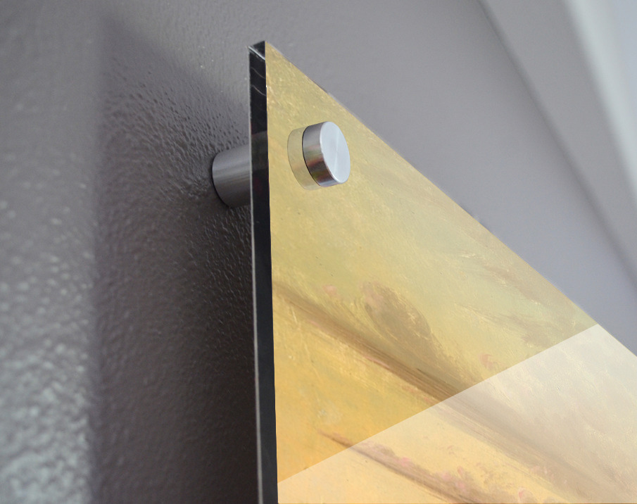 Printed to the edge - Ready to hang - provided with 4 premium polished aluminum stand off ( wall screws and mounting hardware provided ) We suggest a thicker 3/16" acrylic for any size over 42 inches to guarantee a straight acrylic, without curvature