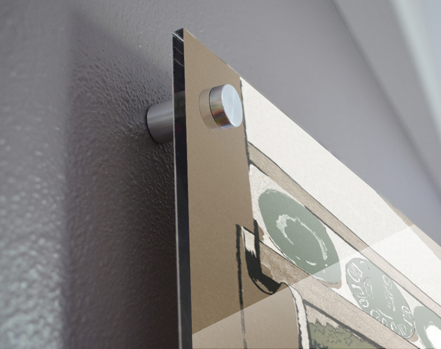 Printed to the edge - Ready to hang - provided with 4 premium polished aluminum stand off ( wall screws and mounting hardware provided ) We suggest a thicker 3/16" acrylic for any size over 42 inches to guarantee a straight acrylic, without curvature