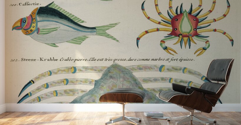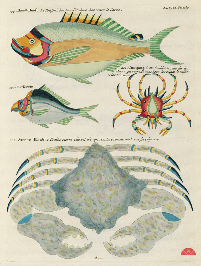ABOUT THIS ARTWORK: COLOURFUL AND SURREAL ILLUSTRATIONS OF FISHES FOUND IN MOLUCCAS INDONESIA AND THE EAST INDIES BY LOUIS RENARD 1678 -1746 FROM HISTOIRE NATURELLE DES PLUS RARES CURIOSITEZ DE LA MER DES INDES 1754.