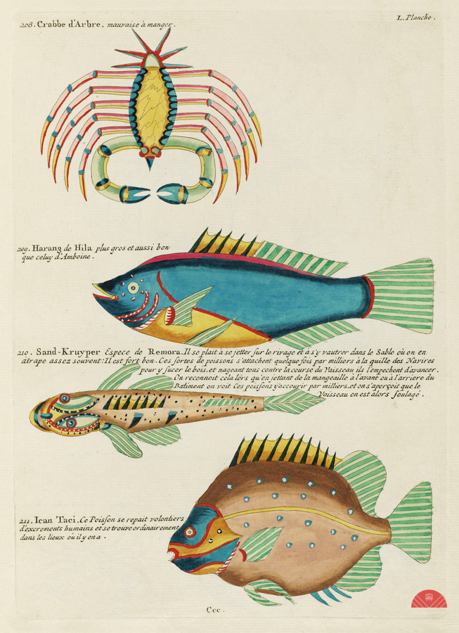 COLOURFUL AND SURREAL ILLUSTRATIONS OF FISHES AND CRAB FOUND IN MOLUCCAS INDONESIA AND THE EAST INDIES BY LOUIS RENARD 1678 -1746 FROM HISTOIRE NATURELLE DES PLUS RARES CURIOSITEZ DE LA MER DES INDES 1754.