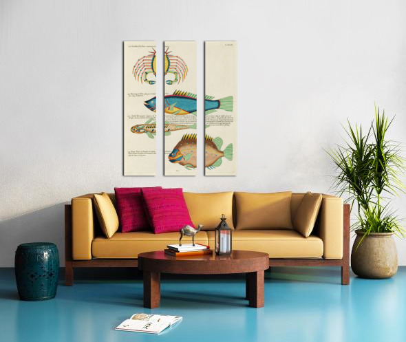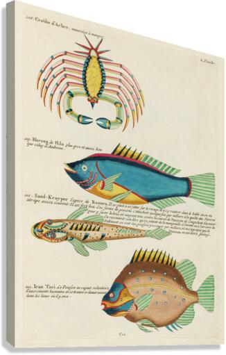 Colourful and surreal illustrations of fishes and crab found in Moluccas Indonesia and the East Indies by Louis Renard 1678 -1746 from Histoire naturelle des plus rares curiositez de la mer des Indes 1754. Canvas print