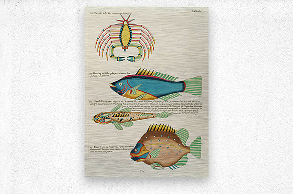 ABOUT THIS ARTWORK: COLOURFUL AND SURREAL ILLUSTRATIONS OF FISHES AND CRAB FOUND IN MOLUCCAS INDONESIA AND THE EAST INDIES BY LOUIS RENARD 1678 -1746 FROM HISTOIRE NATURELLE DES PLUS RARES CURIOSITEZ DE LA MER DES INDES 1754.