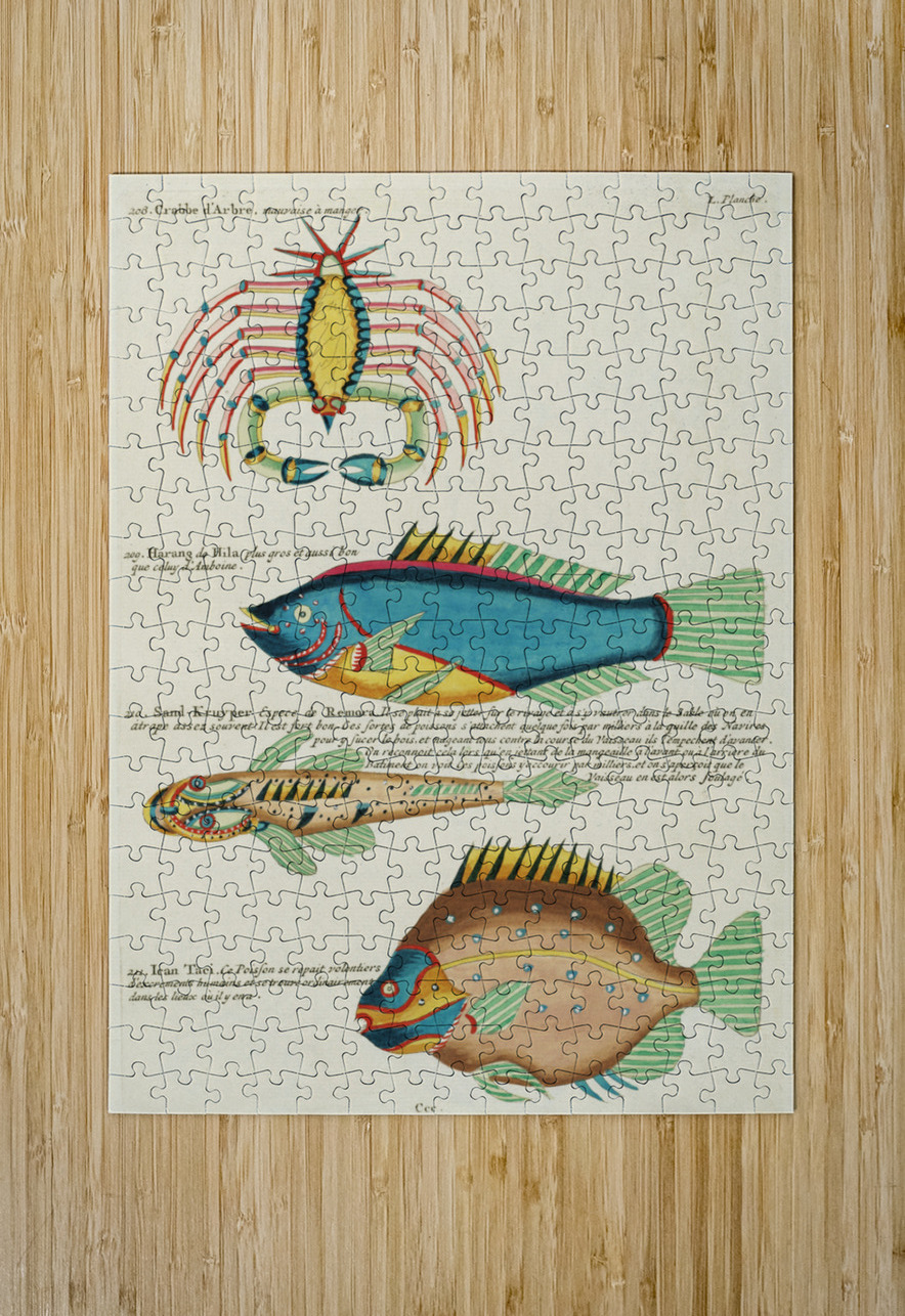 Colourful and surreal illustrations of fishes and crab found in Moluccas Indonesia and the East Indies by Louis Renard 1678 -1746 from Histoire naturelle des plus rares curiositez de la mer des Indes 1754. IStockHistory com Puzzle printing