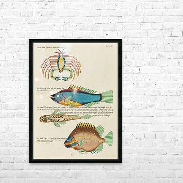 Colourful and surreal illustrations of fishes and crab found in Moluccas Indonesia and the East Indies by Louis Renard 1678 -1746 from Histoire naturelle des plus rares curiositez de la mer des Indes 1754. Picture Frame Printing