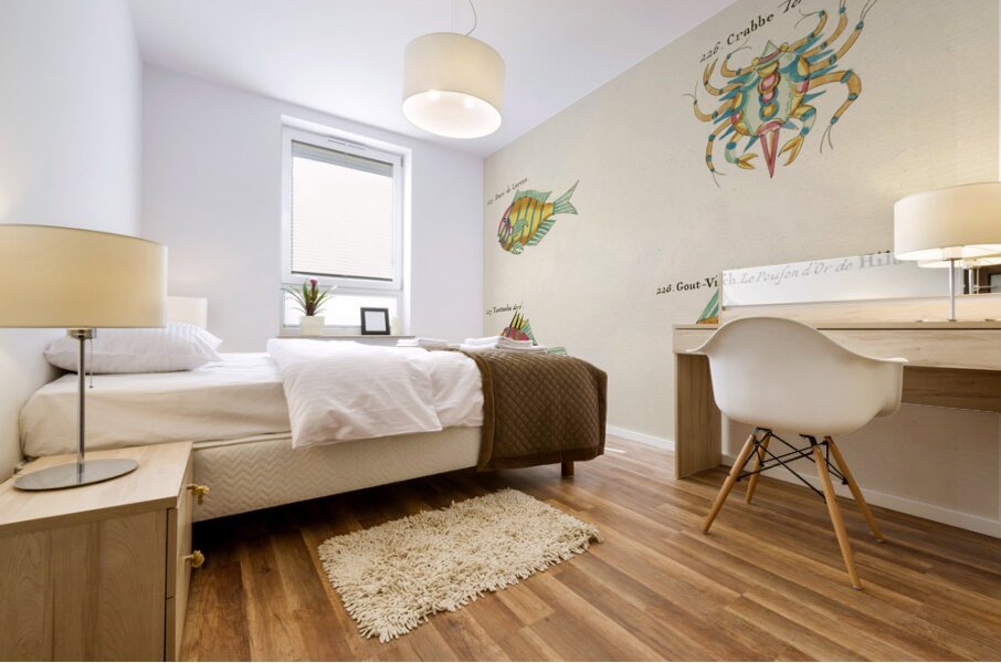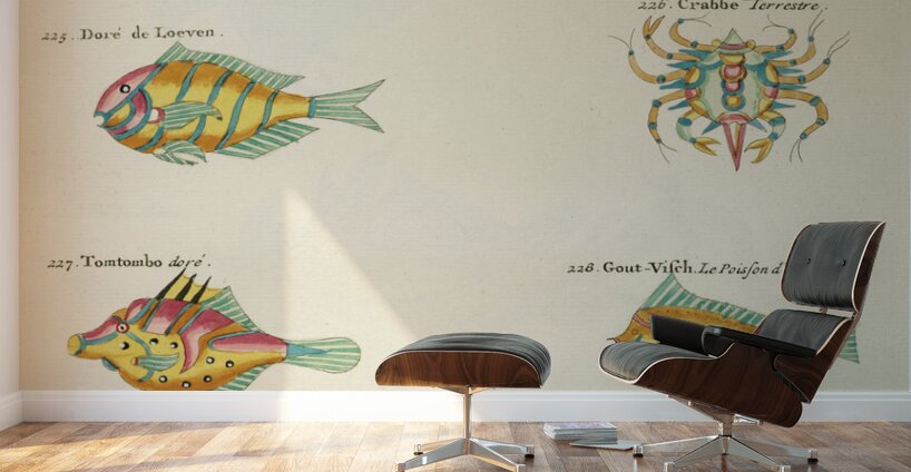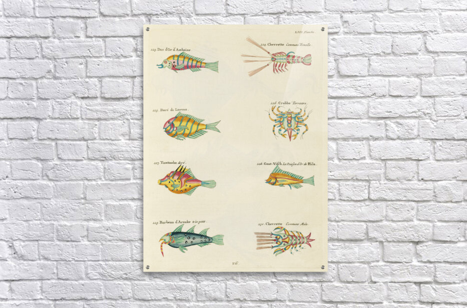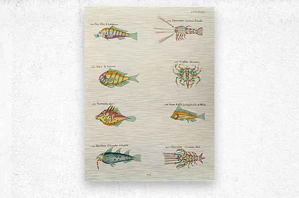 ABOUT THIS ARTWORK: COLOURFUL AND SURREAL ILLUSTRATIONS OF FISHES LOBSTERS AND CRAB FOUND IN MOLUCCAS INDONESIA AND THE EAST INDIES BY LOUIS RENARD 1678 -1746 FROM HISTOIRE NATURELLE DES PLUS RARES CURIOSITEZ DE LA MER DES INDES 1754.