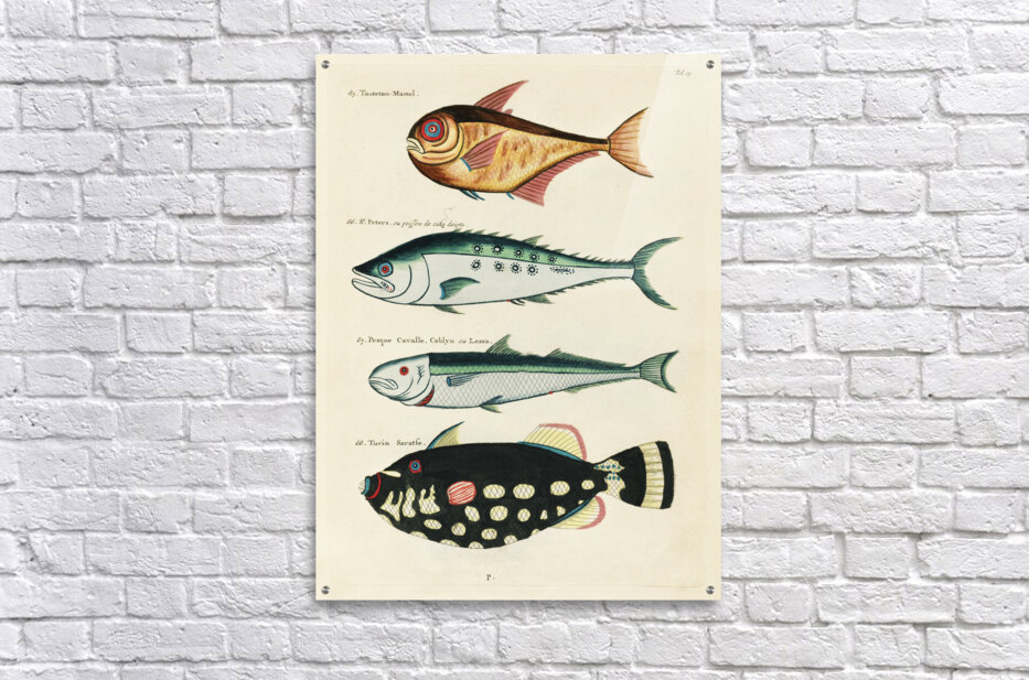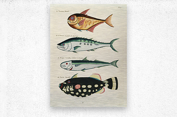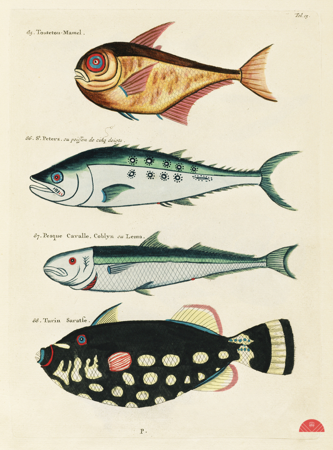 ABOUT THIS ARTWORK: COLOURFUL AND SURREAL ILLUSTRATIONS OF FISHES FOUND IN MOLUCCAS INDONESIA AND THE EAST INDIES BY LOUIS RENARD 1678 -1746 FROM HISTOIRE NATURELLE DES PLUS RARES CURIOSITEZ DE LA MER DES INDES 1754.