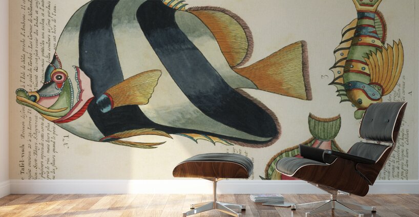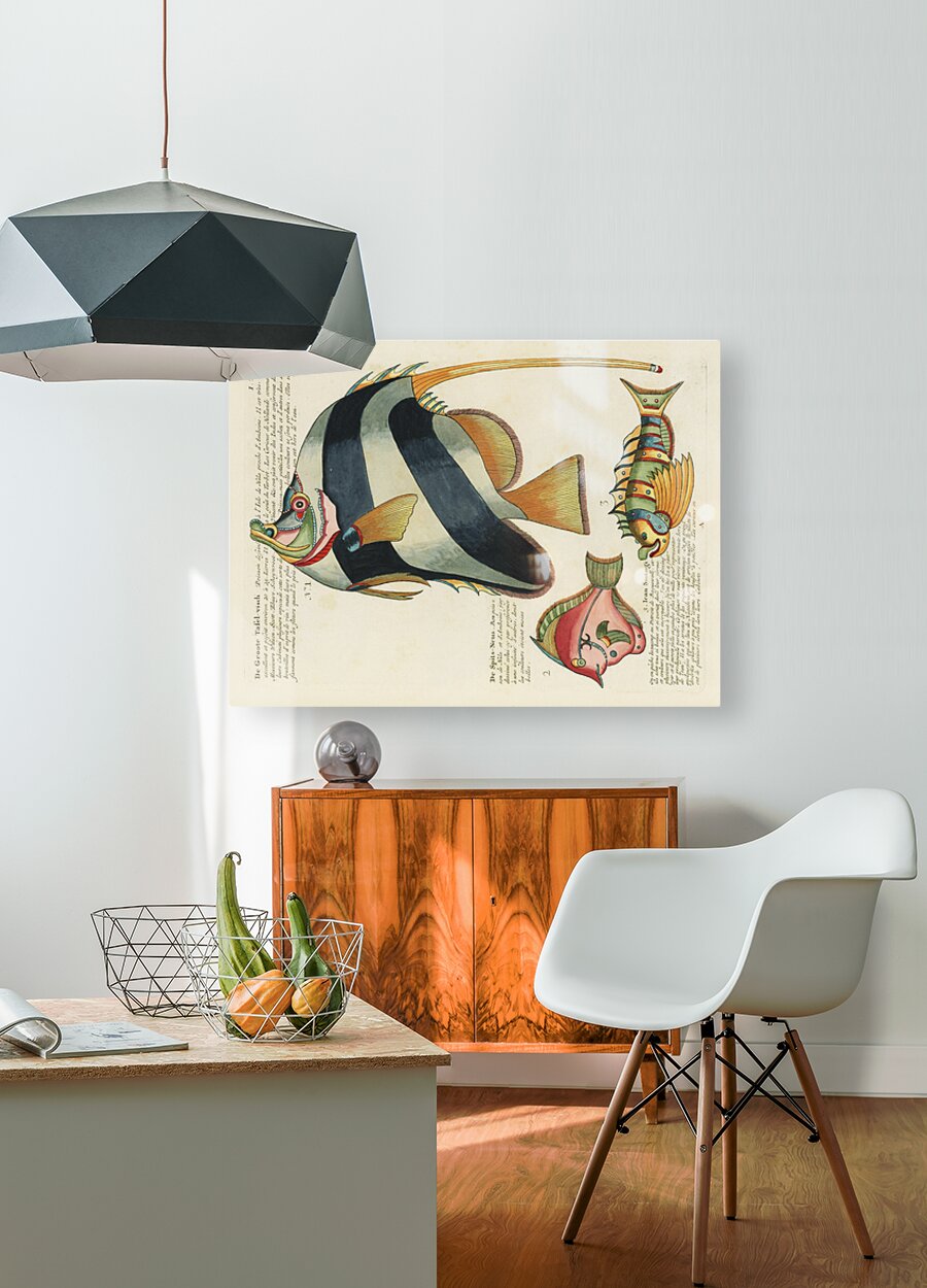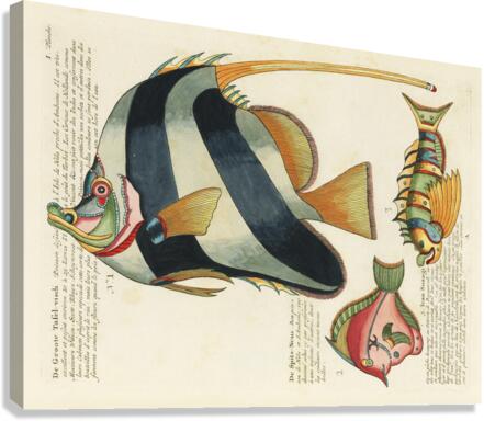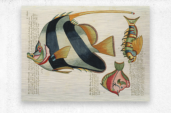 ABOUT THIS ARTWORK: COLOURFUL AND SURREAL ILLUSTRATIONS OF FISHES FOUND IN MOLUCCAS INDONESIA AND THE EAST INDIES BY LOUIS RENARD 1678 -1746 FROM HISTOIRE NATURELLE DES PLUS RARES CURIOSITEZ DE LA MER DES INDES 1754.