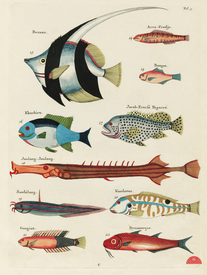 COLOURFUL AND SURREAL ILLUSTRATIONS OF FISHES FOUND IN MOLUCCAS INDONESIA AND THE EAST INDIES BY LOUIS RENARD 1678 -1746 FROM HISTOIRE NATURELLE DES PLUS RARES CURIOSITEZ DE LA MER DES INDES 1754.