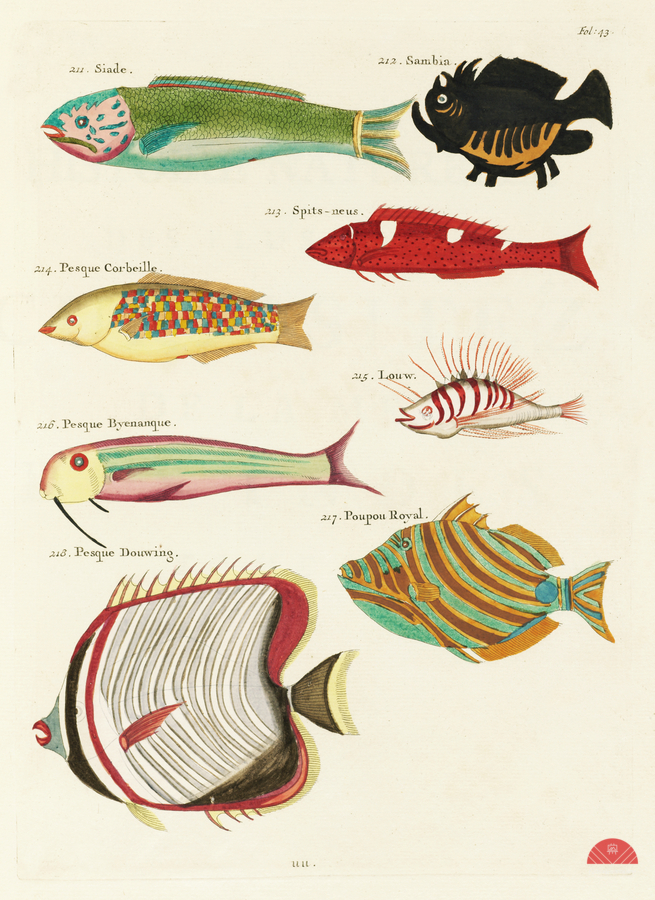 COLOURFUL AND SURREAL ILLUSTRATIONS OF FISHES FOUND IN MOLUCCAS INDONESIA AND THE EAST INDIES BY LOUIS RENARD 1678 -1746 FROM HISTOIRE NATURELLE DES PLUS RARES CURIOSITEZ DE LA MER DES INDES 1754.