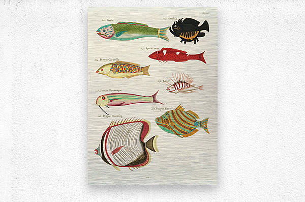 ABOUT THIS ARTWORK: COLOURFUL AND SURREAL ILLUSTRATIONS OF FISHES FOUND IN MOLUCCAS INDONESIA AND THE EAST INDIES BY LOUIS RENARD 1678 -1746 FROM HISTOIRE NATURELLE DES PLUS RARES CURIOSITEZ DE LA MER DES INDES 1754.