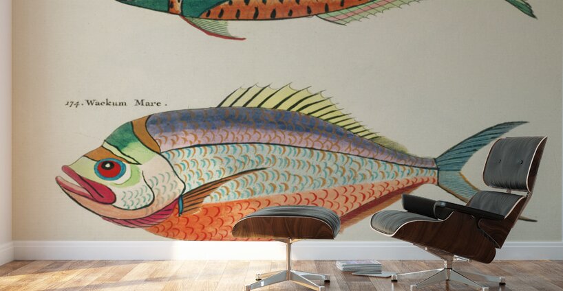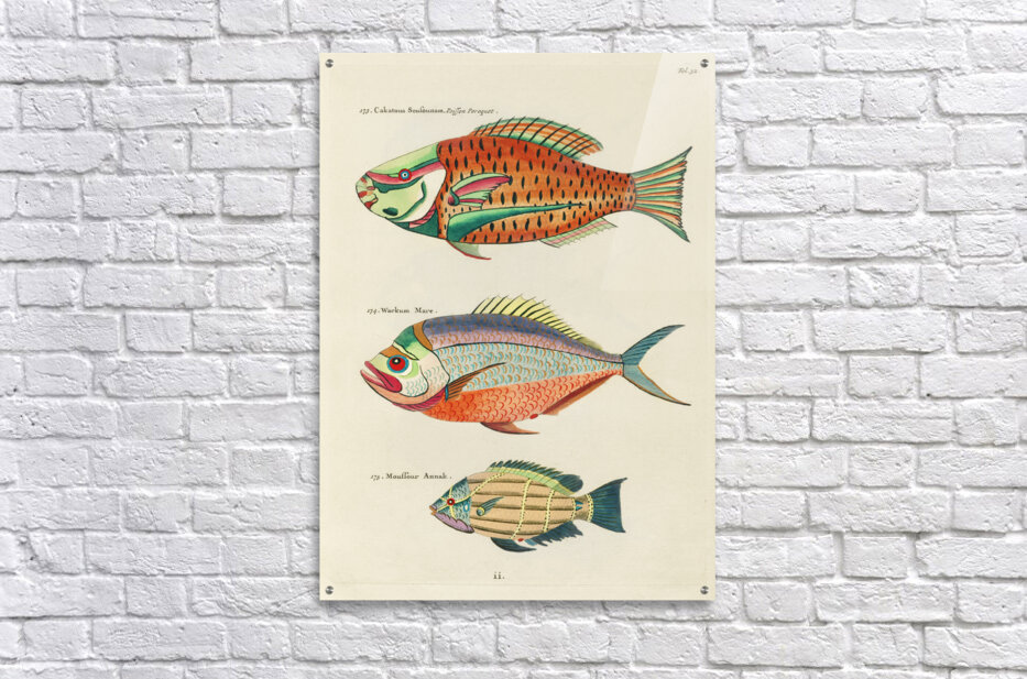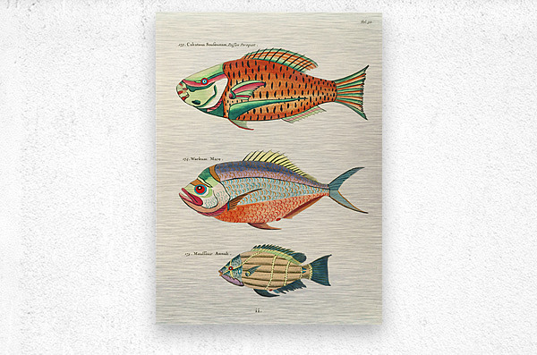 ABOUT THIS ARTWORK: COLOURFUL AND SURREAL ILLUSTRATIONS OF FISHES FOUND IN MOLUCCAS INDONESIA AND THE EAST INDIES BY LOUIS RENARD 1678 -1746 FROM HISTOIRE NATURELLE DES PLUS RARES CURIOSITEZ DE LA MER DES INDES 1754.