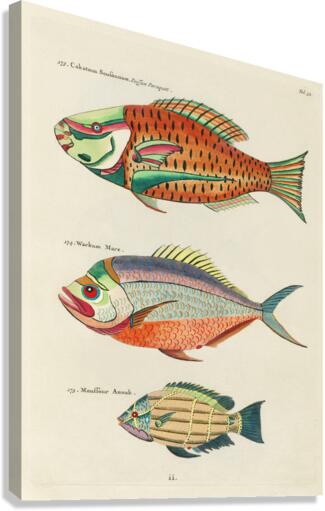 Colourful and surreal illustrations of fishes found in Moluccas Indonesia and the East Indies by Louis Renard 1678 -1746 from Histoire naturelle des plus rares curiositez de la mer des Indes 1754. Canvas print