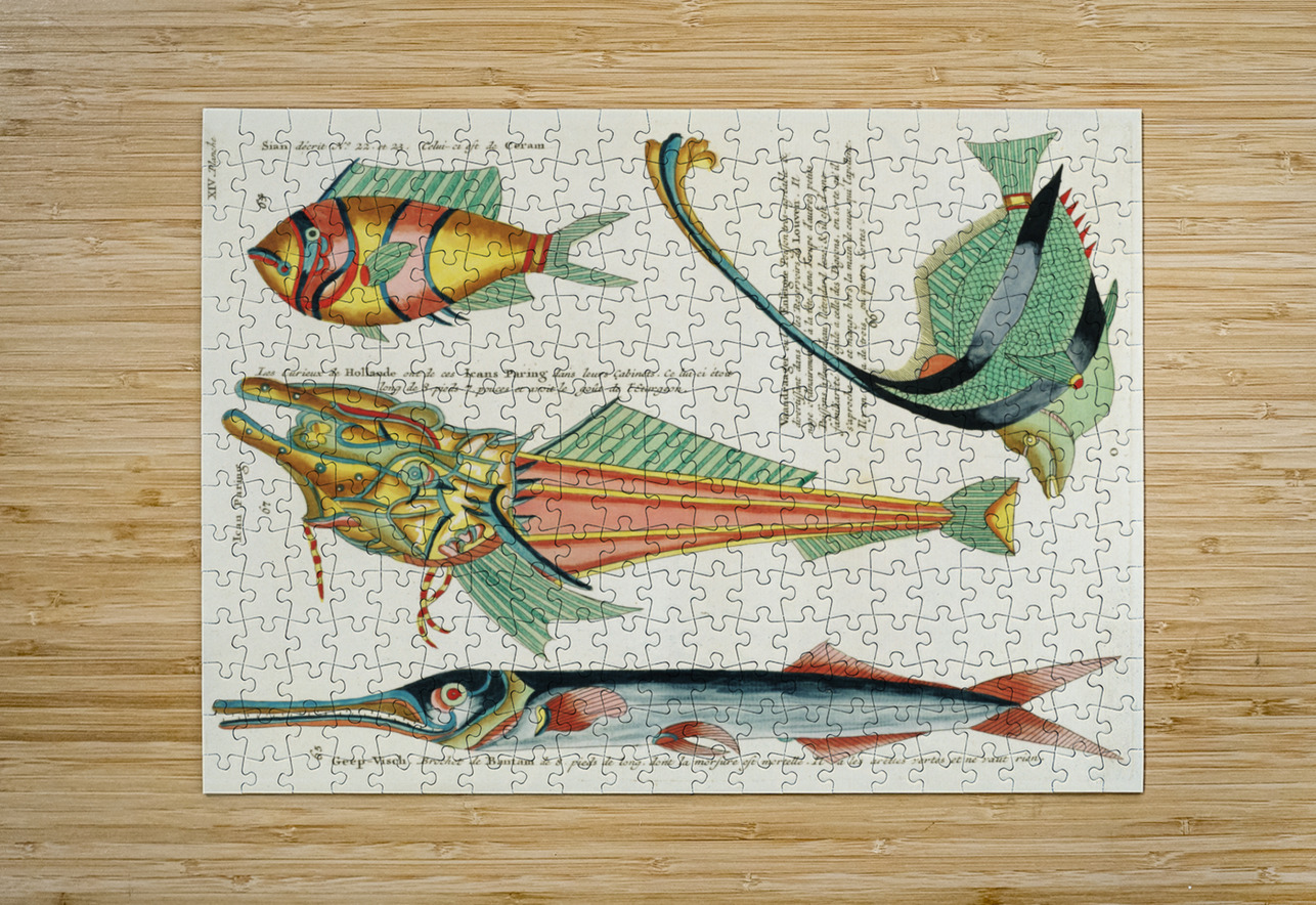 Colourful and surreal illustrations of fishes found in Moluccas Indonesia and the East Indies by Louis Renard 1678 -1746 from Histoire naturelle des plus rares curiositez de la mer des Indes 1754. IStockHistory com Puzzle