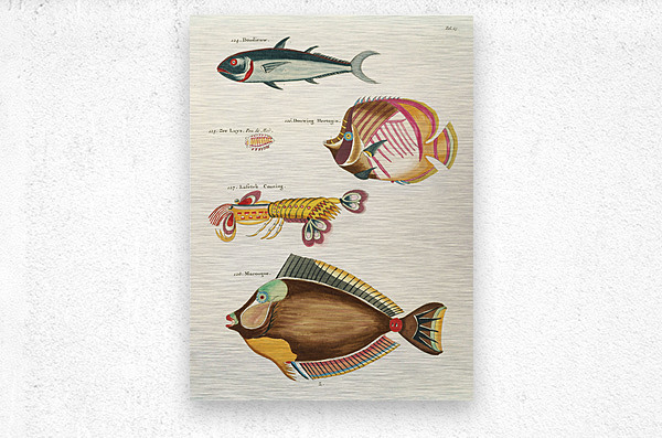 ABOUT THIS ARTWORK: COLOURFUL AND SURREAL ILLUSTRATIONS OF FISHES AND LOBSTER FOUND IN MOLUCCAS INDONESIA AND THE EAST INDIES BY LOUIS RENARD 1678 -1746 FROM HISTOIRE NATURELLE DES PLUS RARES CURIOSITEZ DE LA MER DES INDES 1754.