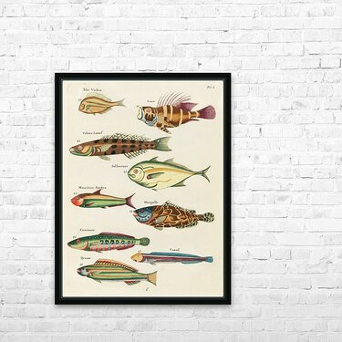Colourful and surreal illustrations of fishes found in Moluccas Indonesia and the East Indies by Louis Renard 1678 -1746 from Histoire naturelle des plus rares curiositez de la mer des Indes 1754. Picture Frame Printing