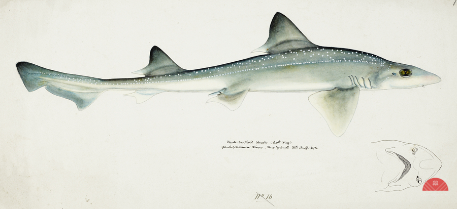 Antique fish Mustelus Antarcticus shark drawn by Frank Edward Clarke 1849-1899.
