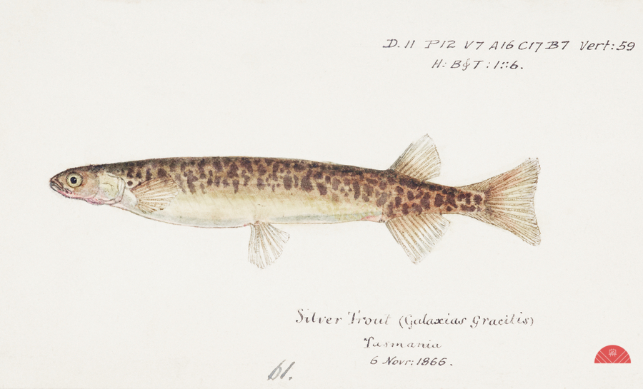 Antique fish galaxias gracilis dwarf inanga drawn by Frank Edward Clarke 1849-1899.