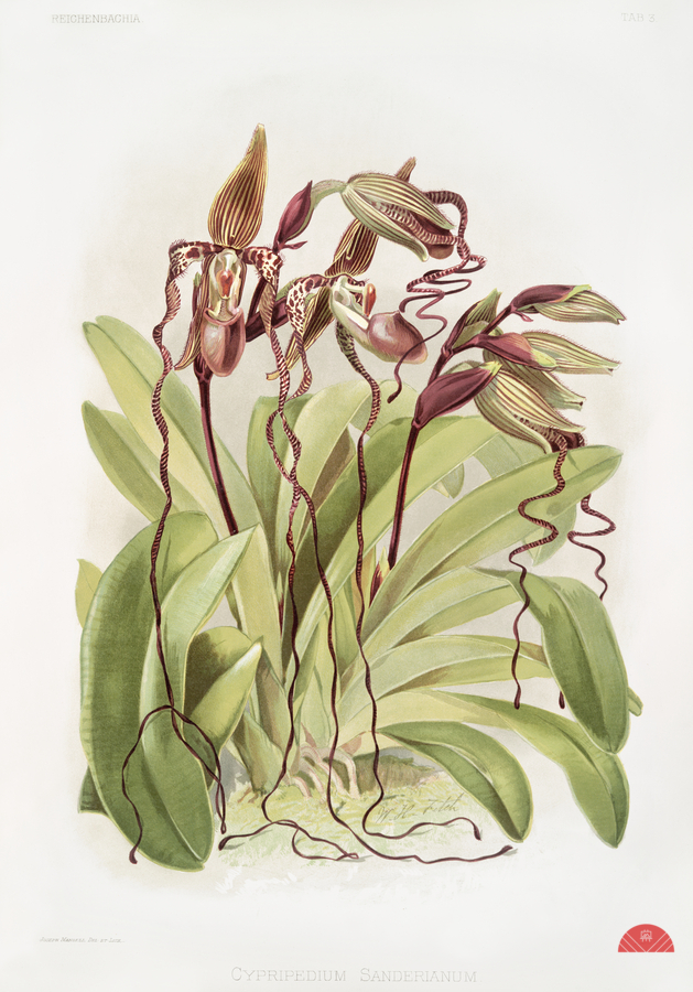 ABOUT THIS ARTWORK: CYPRIPEDIUM SANDERIANUM FROM REICHENBACHIA ORCHIDS 1888-1894 BY FREDERICK SANDER 1847-1920.