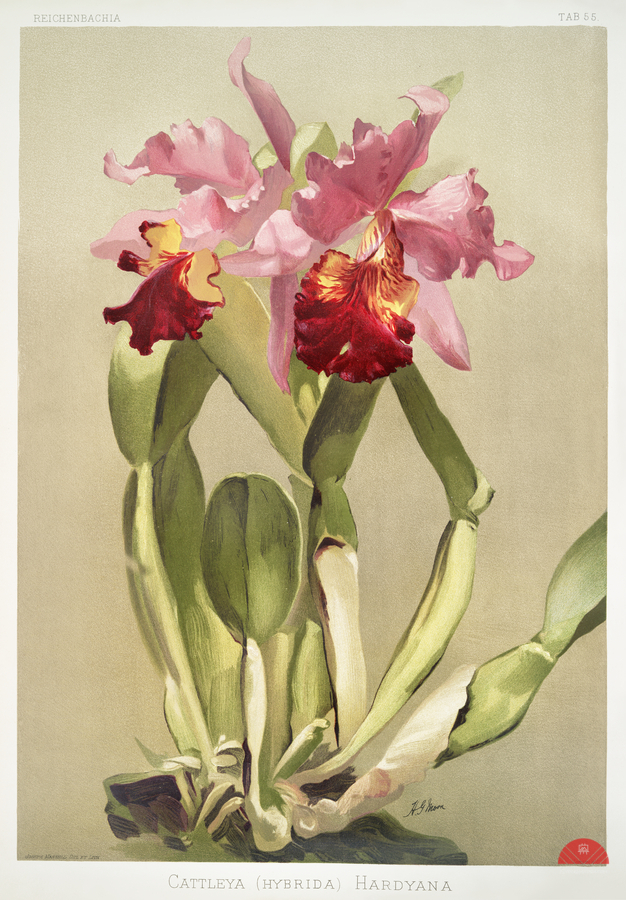 Cattleya hybrida hardyana from Reichenbachia Orchids 1888-1894 illustrated by Frederick Sander 1847-1920.