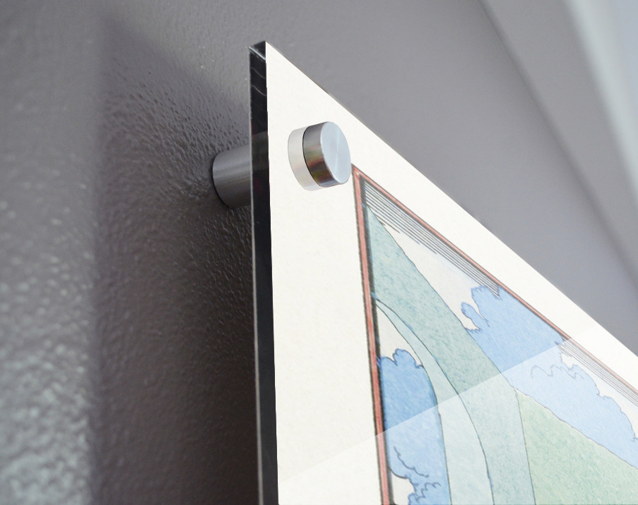 Printed to the edge - Ready to hang - provided with 4 premium polished aluminum stand off ( wall screws and mounting hardware provided ) We suggest a thicker 3/16" acrylic for any size over 42 inches to guarantee a straight acrylic, without curvature