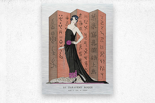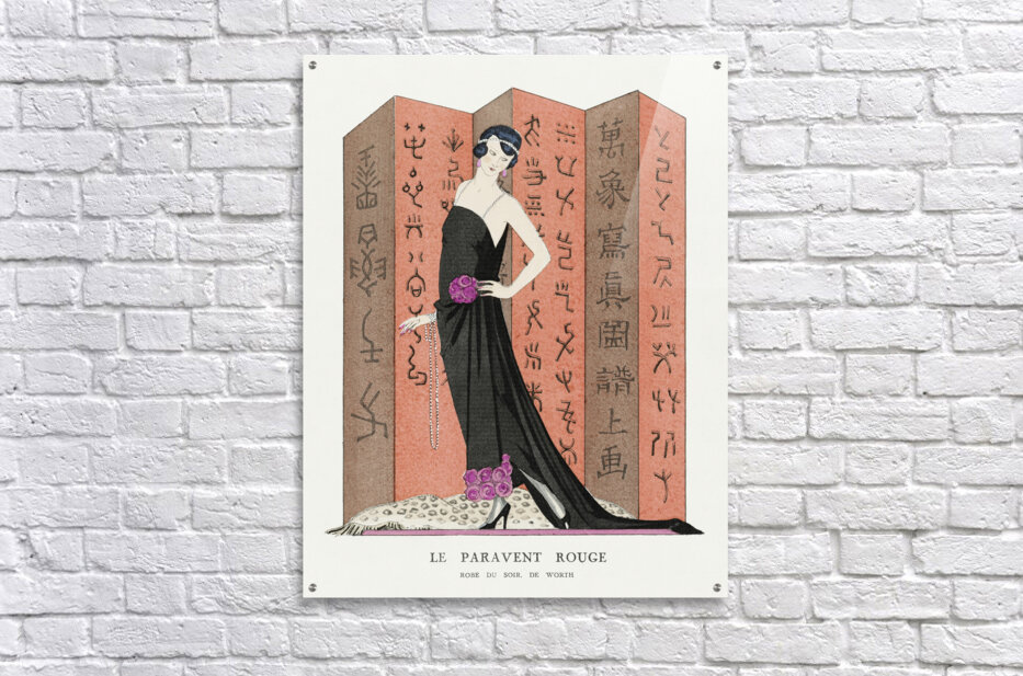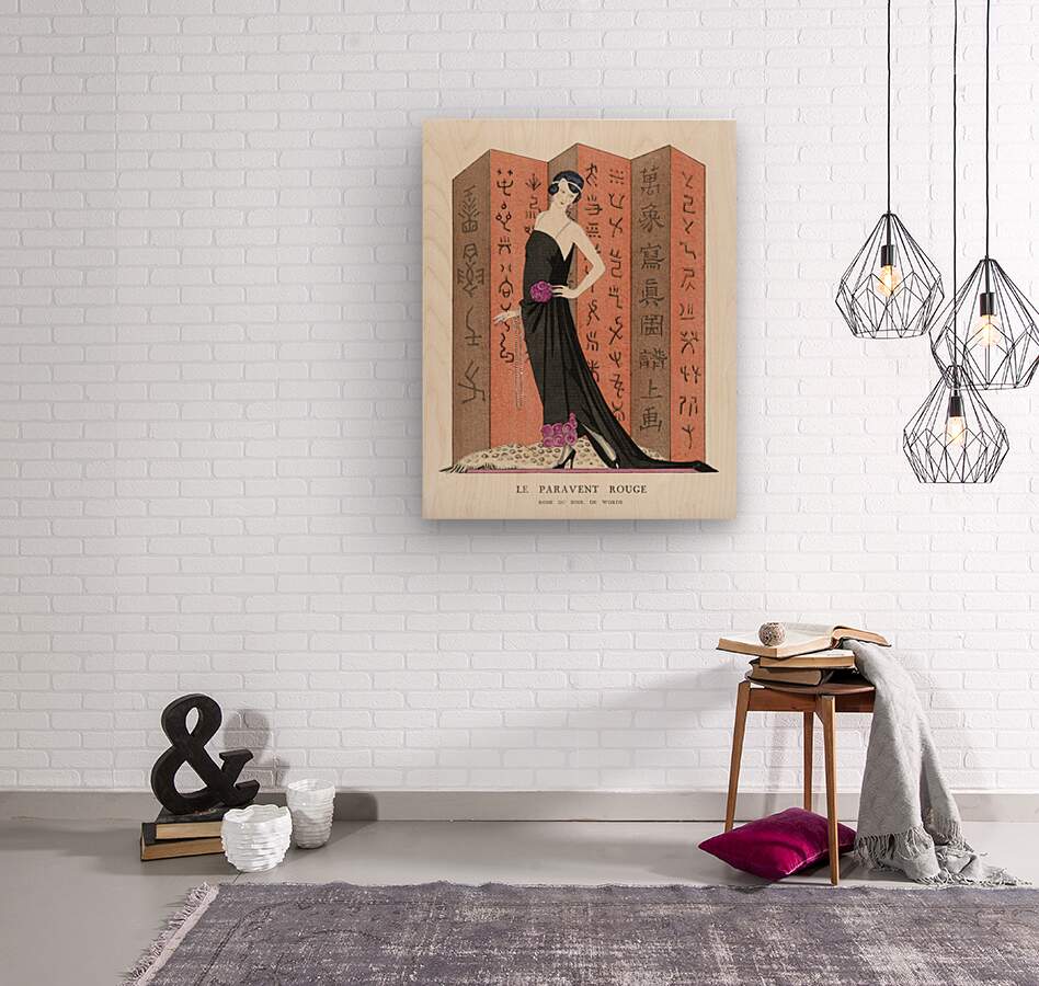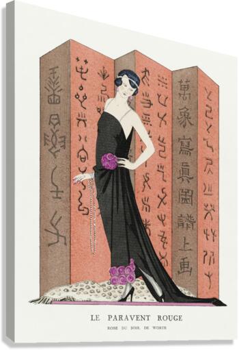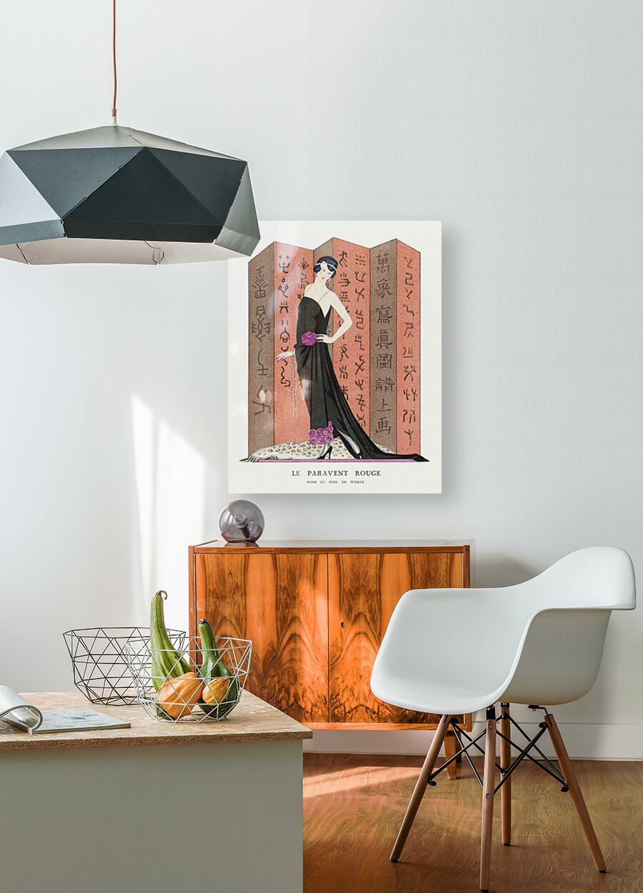 Le paravent rouge: Robe du soir de Worth from Gazette du Bon Ton. Art &ndash Modes & Frivolit&eacutes: Famous Fashion Houses No. 10 Pl. 80 1921 fashion illustration  by George Barbier.   Wood print