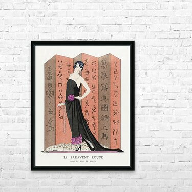 Le paravent rouge: Robe du soir de Worth from Gazette du Bon Ton. Art &ndash Modes & Frivolit&eacutes: Famous Fashion Houses No. 10 Pl. 80 1921 fashion illustration  by George Barbier.  Picture Frame Printing