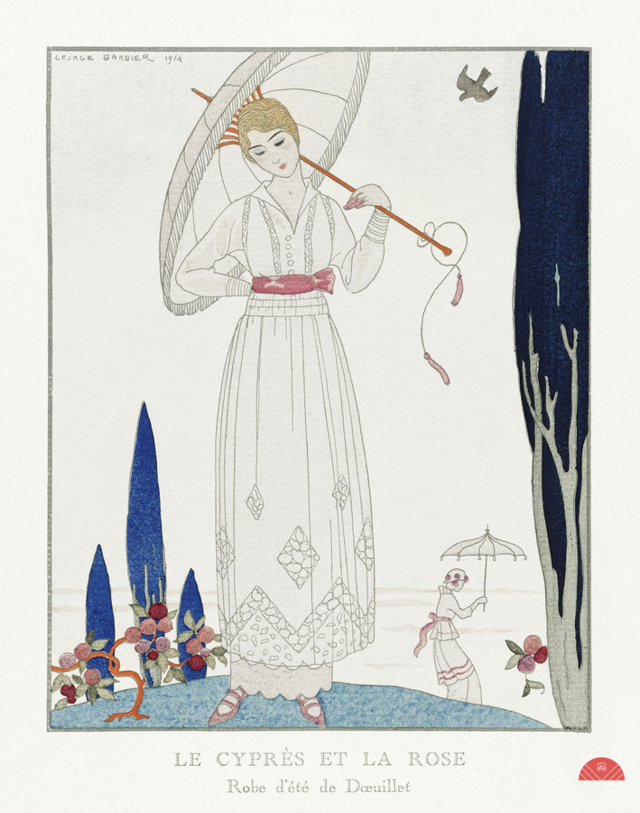 THE CYPRESS AND THE ROSE: SUMMER DRESS BY DOEUILLET FROM GAZETTE DU BON TON NO. 7 PL. 70 1914 FASHION ILLUSTRATION BY GEORGE BARBIER.