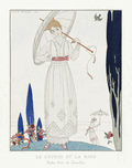 ABOUT THIS ARTWORK: THE CYPRESS AND THE ROSE: SUMMER DRESS BY DOEUILLET FROM GAZETTE DU BON TON NO. 7 PL. 70 1914 FASHION ILLUSTRATION BY GEORGE BARBIER.