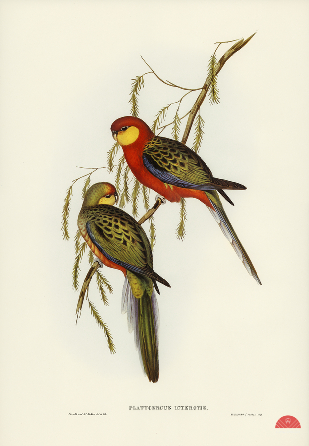 ABOUT THIS ARTWORK: THE EARL OF DERBYS PARRAKEET PLATYCERCUS ICTEROTIS ILLUSTRATED BY ELIZABETH GOULD 1804–1841 FOR JOHN GOULD’S 1804-1881 BIRDS OF AUSTRALIA