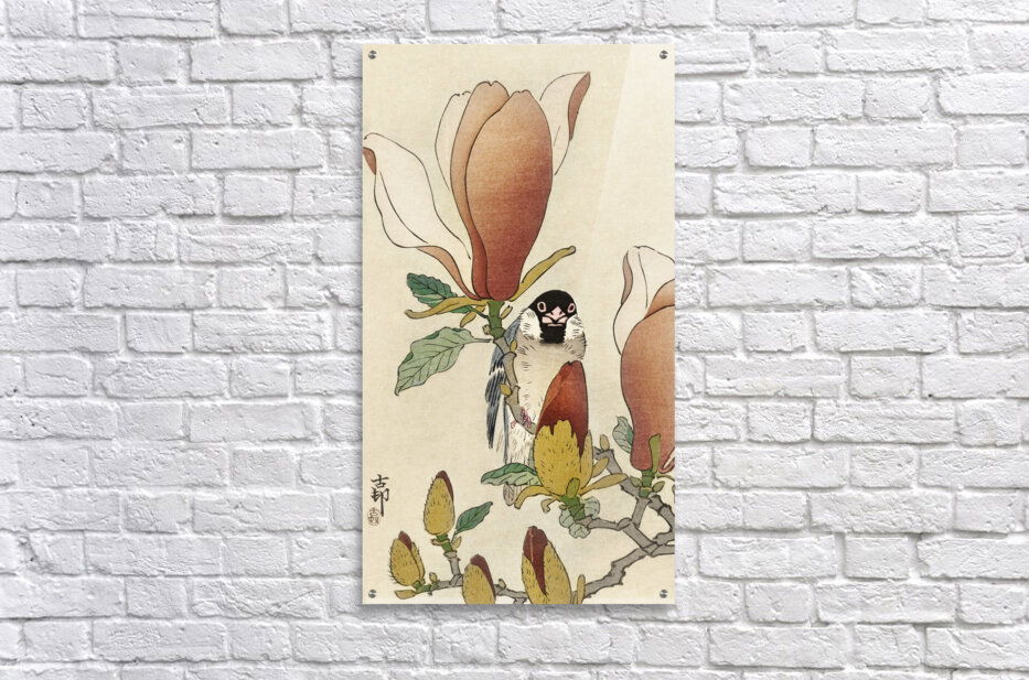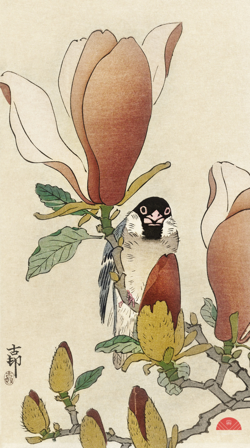 Sparrow on blooming magnolia branch 1900 - 1930 by Ohara Koson 1877-1945.  Wood print