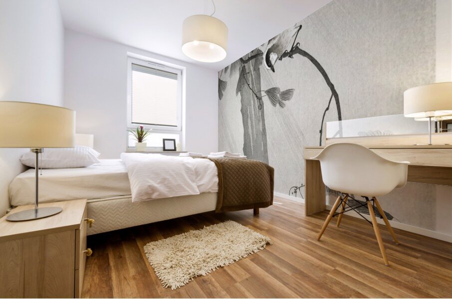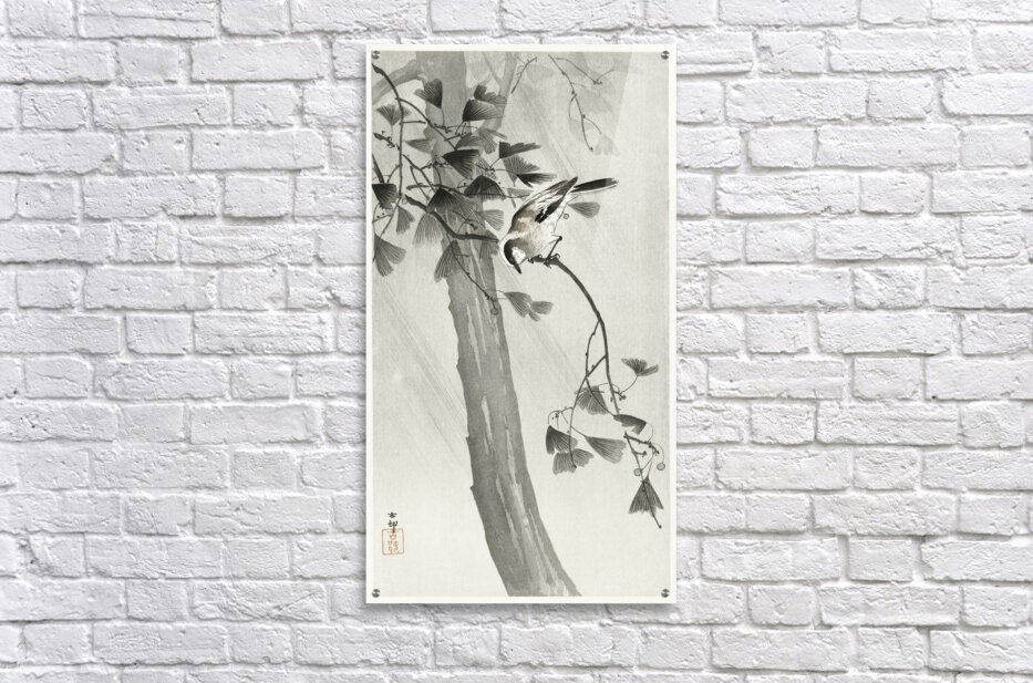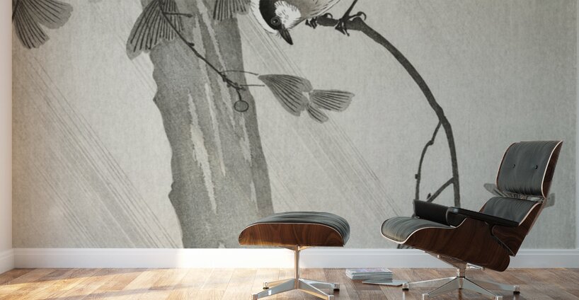 Long-tailed tit in storm 1900 - 1936 by Ohara Koson 1877-1945. Wood print