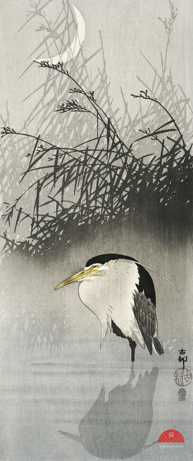 Heron at new moon 1900 - 1910 by Ohara Koson 1877-1945.  Wood print