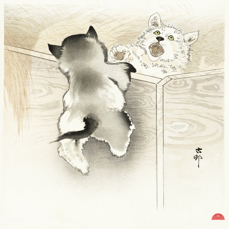 Two playing dogs 1900 - 1930 by Ohara Koson 1877-1945. Wood print