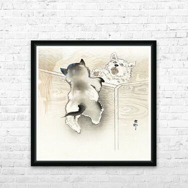 Two playing dogs 1900 - 1930 by Ohara Koson 1877-1945. Frame print