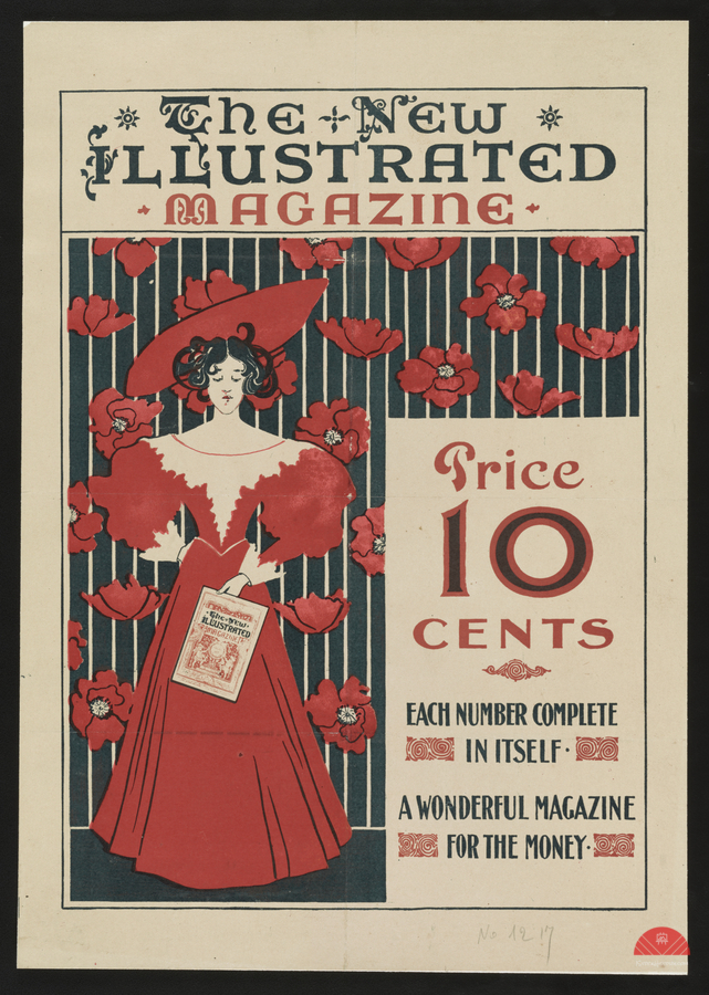 ABOUT THIS ARTWORK: FLOWERS AND A FASHIONABLY DRESSED WOMAN STANDING AND HOLDING COPY OF THE MAGAZINE 1890–1900 PRINT BY ETHEL REED.