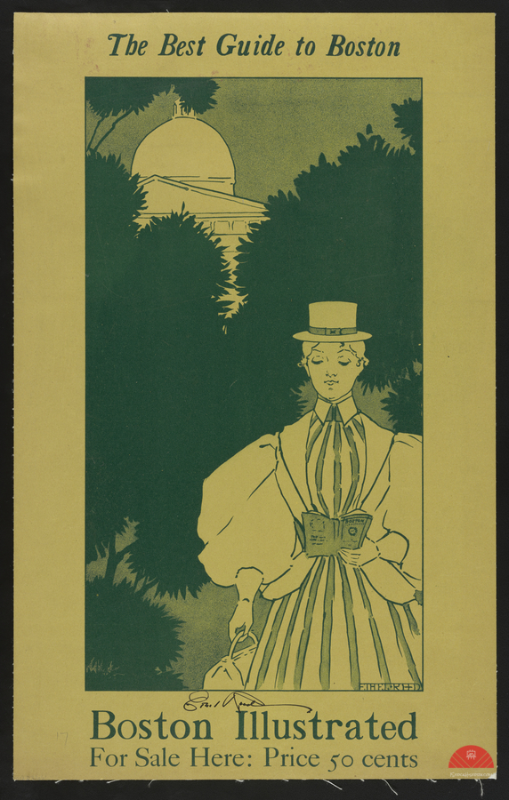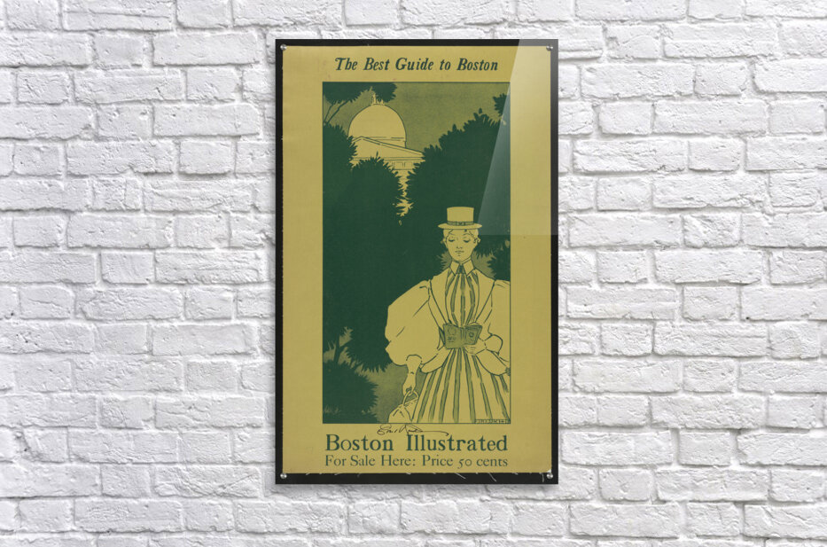Woman wearing a striped dress with large sleeves a hat and carrying a purse 1898–1900 print by Ethel Reed. Picture Frame Printing