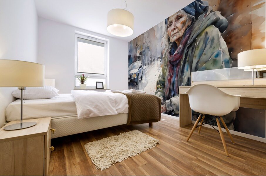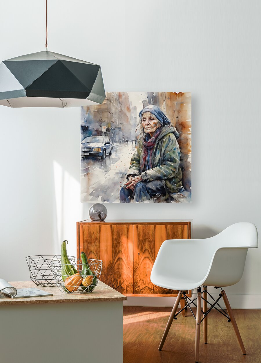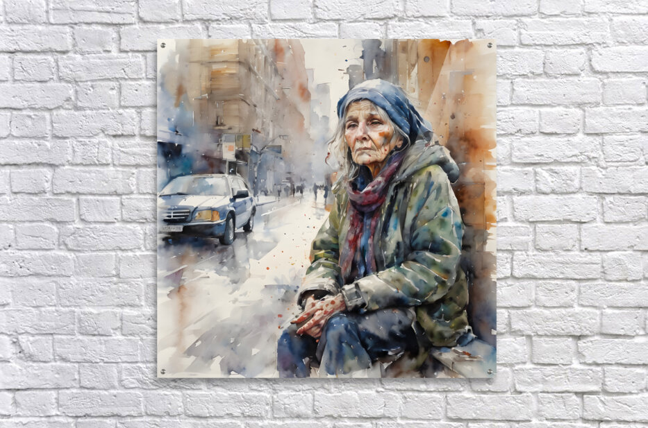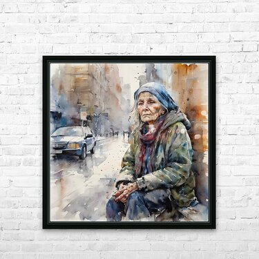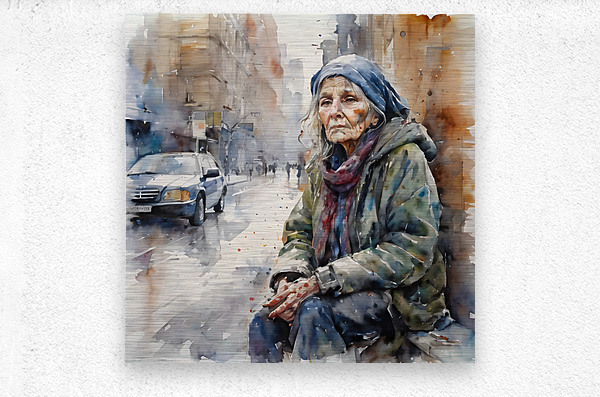 Watercolor of a 50 year old woman who is homeless and cold and in his eyes you can see pain from years of loss and desperation. “Just Me” By Bruce...[+]