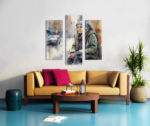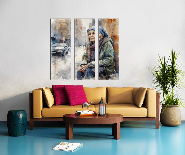 Watercolor of a 50 year old woman who is homeless and cold and in his eyes you can see pain from years of loss and desperation. “Just Me” By Bruce Lazarus