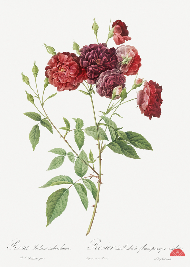 Ternaux Rose also known as Rosebush with almost violet flowers Rosa indica subviolacea from Les Roses 1817–1824 by Pierre-Joseph Redouté.