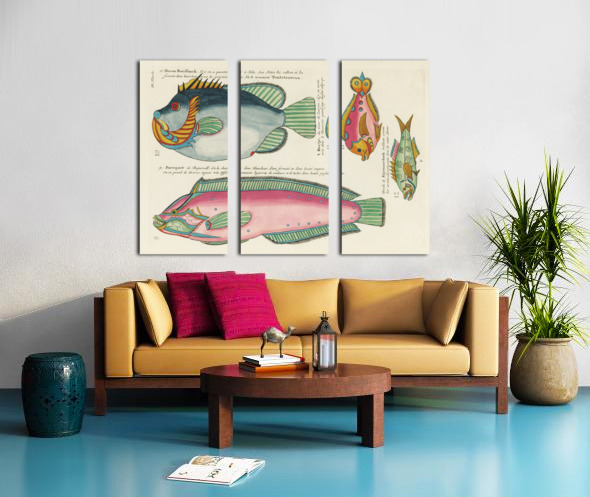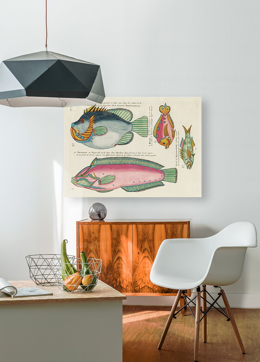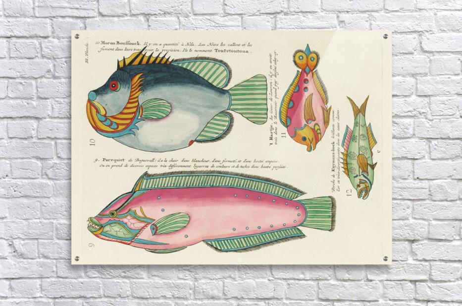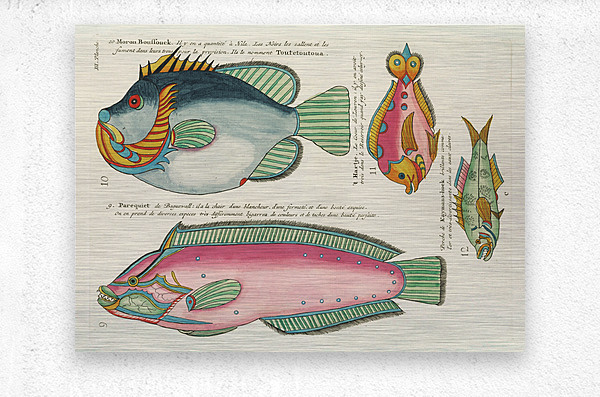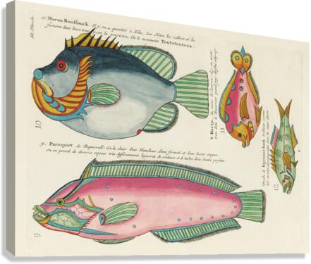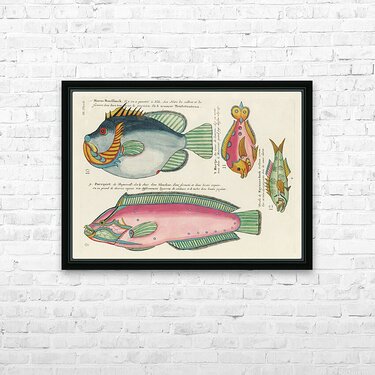 Colourful and surreal illustrations of fishes found in Moluccas Indonesia and the East Indies by Louis Renard 1678 -1746 from Histoire naturelle des plus rares curiositez de la mer des Indes 1754. Impression du cadre